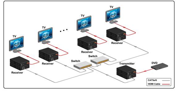 Além disto, você pode transmitir seu sinal de áudio e vídeo HDMI via Rede TCP/IP padrão, para exibí-lo em diversas telas/monitores remotos simultâneamente. A partir de um transmissor HDMI FLEXPORT FX-HE100S, que recebe o sinal na entrada HDMI e entrega na saída RJ45. Você pode usar uma rede TCP/IP padrão, incluindo switches TCP/IP e diversos cabos CAT5e/6, para disseminar o sinal HDMI, até múltiplos receptores HDMI FX-HE100SR, que recebem o sinal na entrada RJ45 e entrega ao monitor na saída HDMI, conforme ilustrado no diagrama de aplicação.