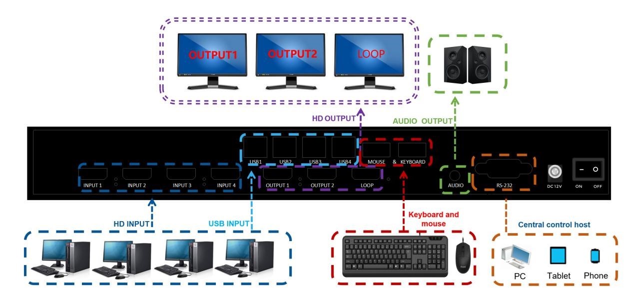 - Suporta 4 canais de entrada USB -AB de computador e 2 canais de entrada de mouse e teclado USB-A