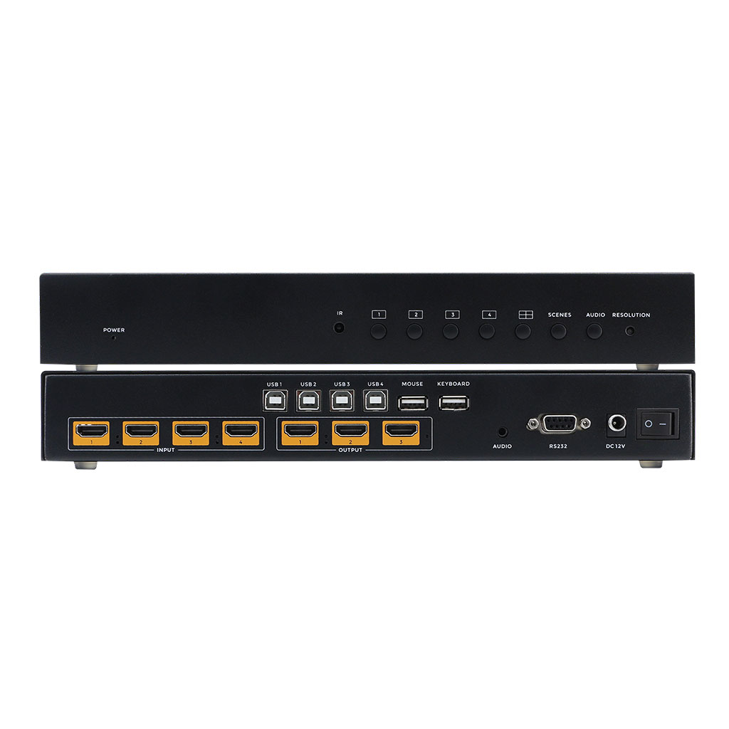 O multiviewer KVM não requer qualquer sistema ou WEB ou outro software de controle. Ele pode alternar rapidamente todos os sinais usando apenas o mouse e o teclado, realizar o dimensionamento independente de cada janela e as resoluções de entrada e saída podem atingir o padrão 4K@60. Os usuários podem escolher uma única tela com 4 imagens para exibir simultaneamente para controlar o tamanho da janela e as operações de mouse e teclado de 4 computadores. Eles também podem optar por operar telas duplas com imagens duplas para exibição separada. Ao mesmo tempo, há também um loop-through para exibição de loop-out ponto a ponto da fonte do sinal de entrada.